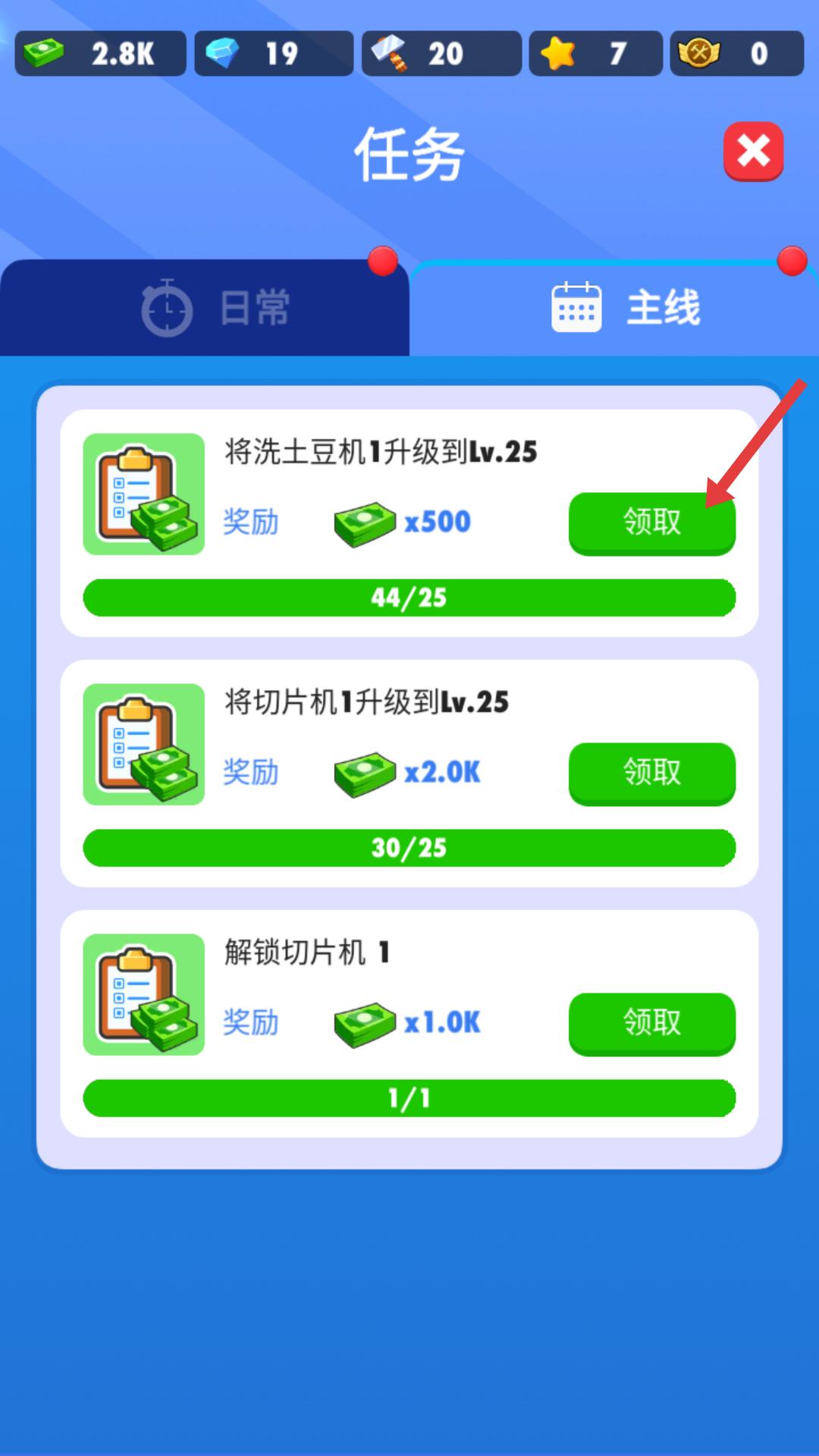 4、進入任務界面,查看主線任務,若完成將洗土豆機1升級到Lv.25等任務,點擊領取,可獲得豐厚的金幣獎勵。