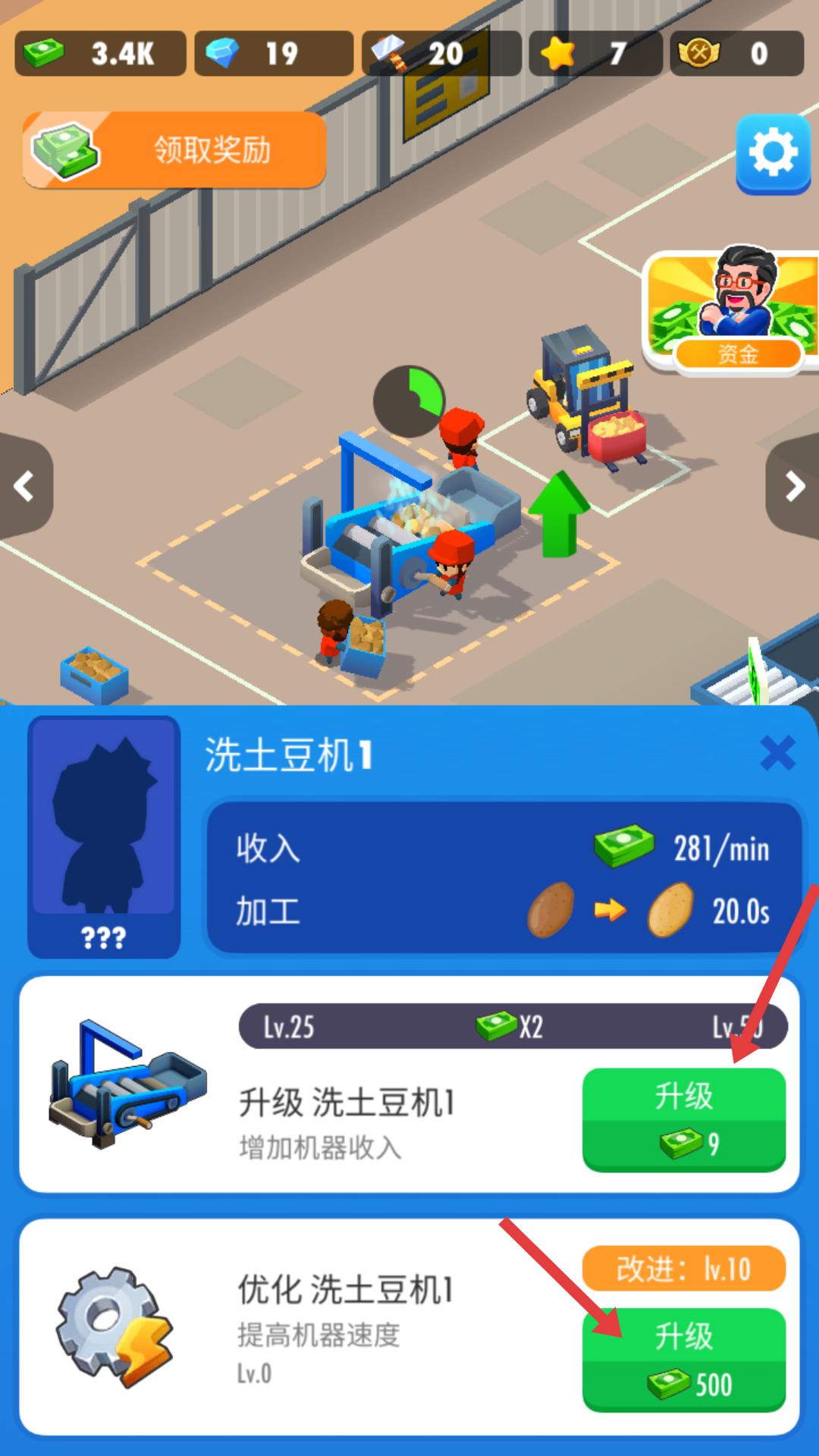 2、在機器詳情界面,針對洗土豆機,點擊升級按鈕,消耗對應金幣,能提升機器收入與加工效率,助力生產。