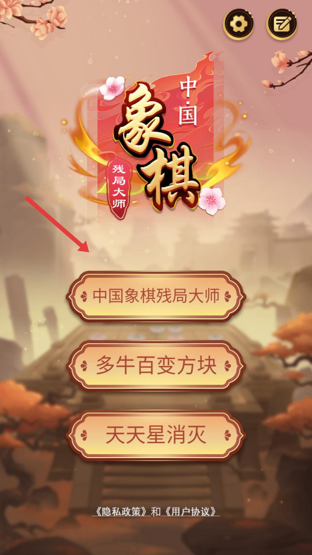 1、進入游戲,能看到帶有中國風元素的界面,有多個游戲選項,選擇中國象棋殘局大師,開啟象棋殘局挑戰之旅。