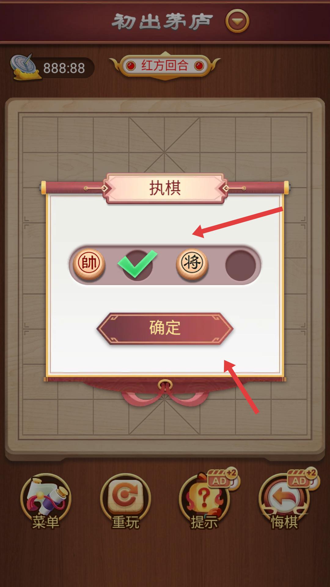 3、在執棋選擇界面,可選擇帥或將,選好后點擊確定,進入象棋對弈環節,開始進行棋子的移動與策略布局。