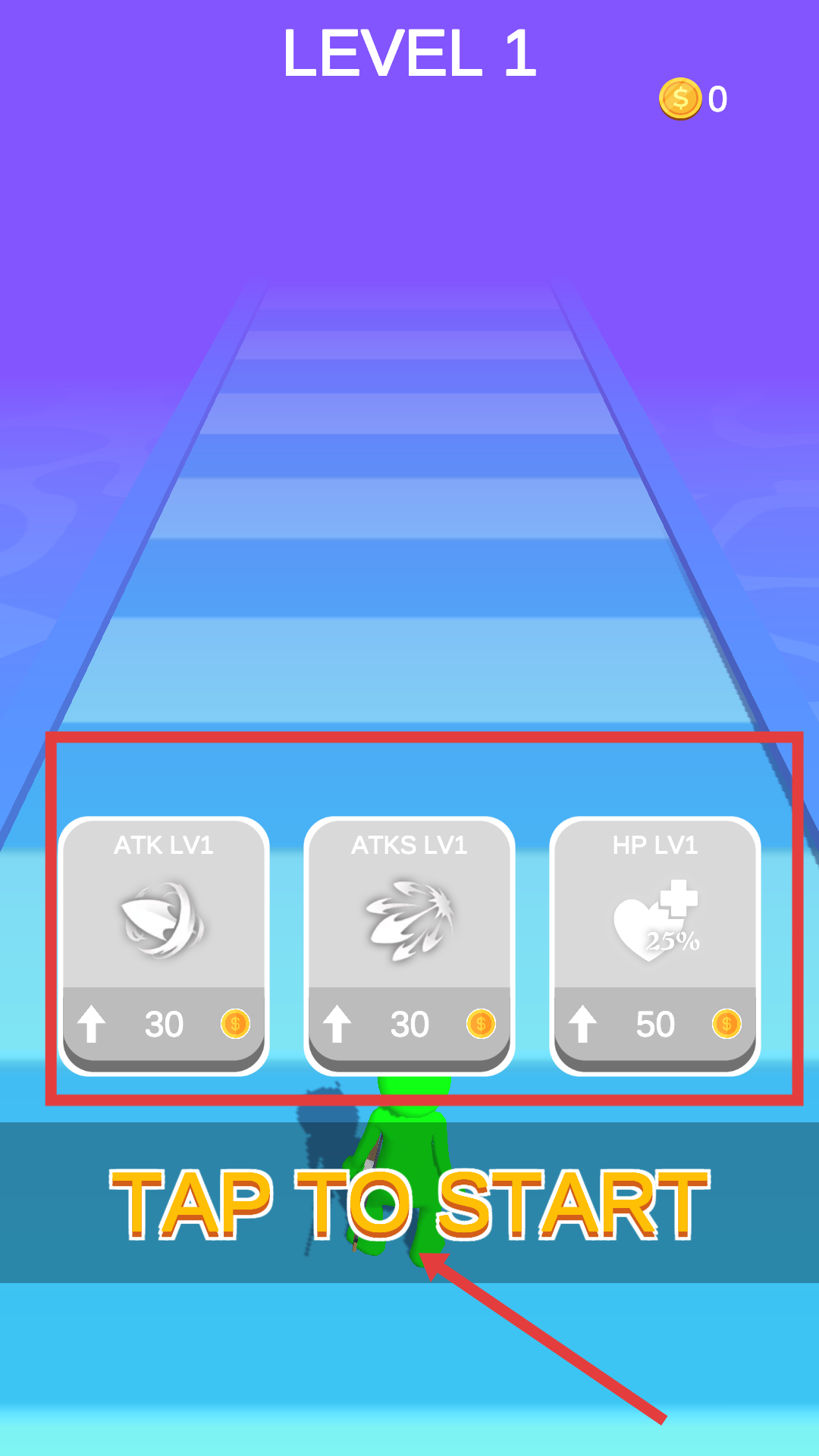 1、進入弓箭手戰士酷跑游戲,在關卡開始前可花費金幣提升攻擊力、攻擊次數或生命值,增強自身戰斗能力,之后點擊TAP TO START開啟關卡挑戰。