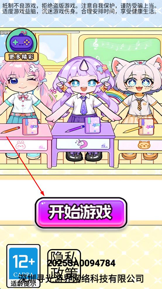 1、點擊開始游戲按鈕進入,可以留意適齡提示與公司信息,開啟趣味換裝之旅。