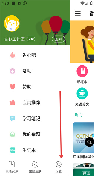 2、在展開的側邊欄中找到并點擊設置選項,進入應用的設置頁面,設置頁面里有各類功能的設置項。