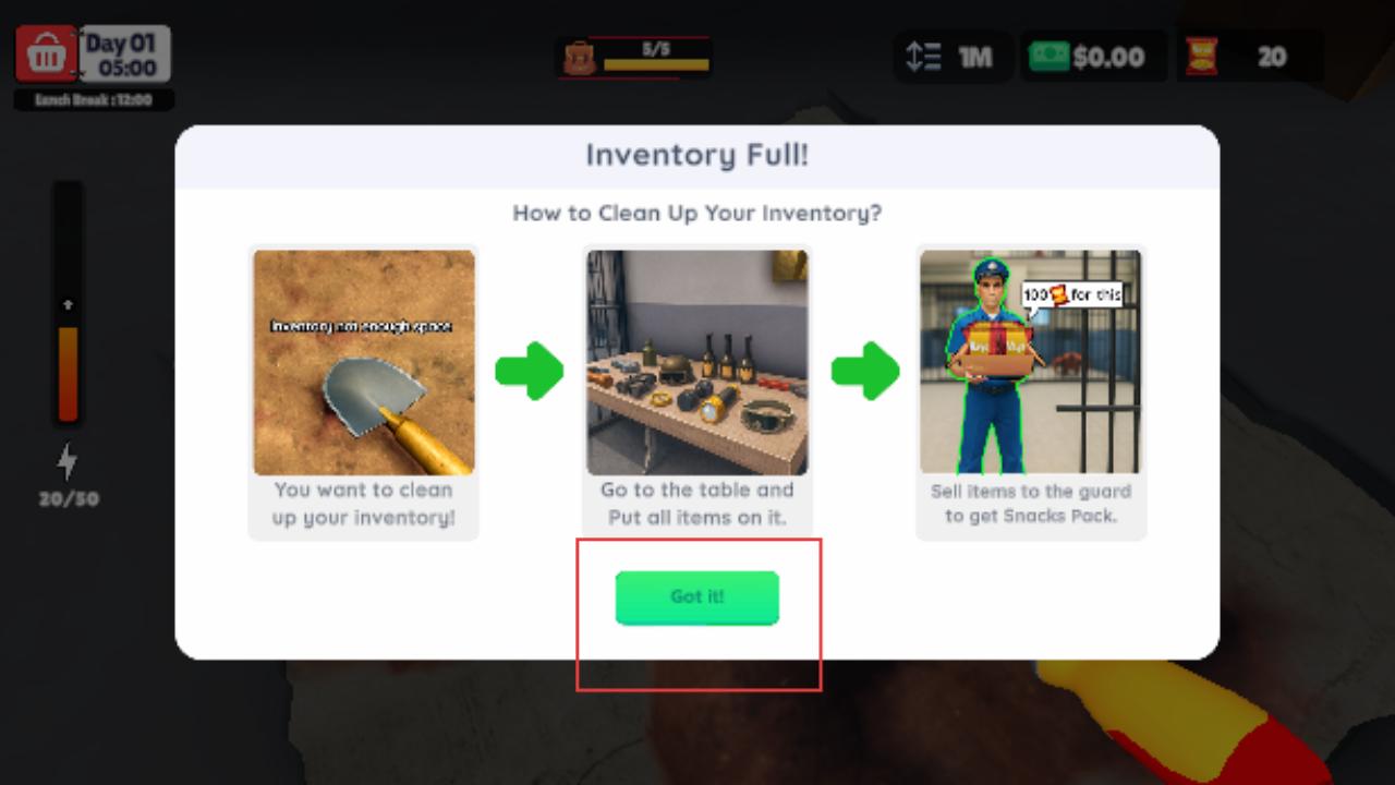 4、當物品收集滿,會彈出庫存已滿的提示界面,點擊Got it按鈕,了解清理庫存的方法,以便繼續收集物品推進逃脫。