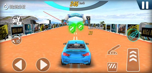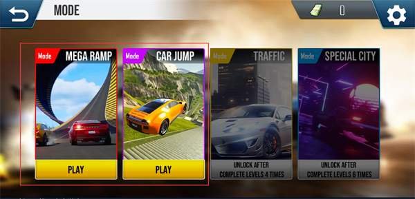 1、在游戲主界面的MODE選項中有多種模式可供選擇,比如選擇MEGA RAMP模式,點擊PLAY按鈕開始游戲。