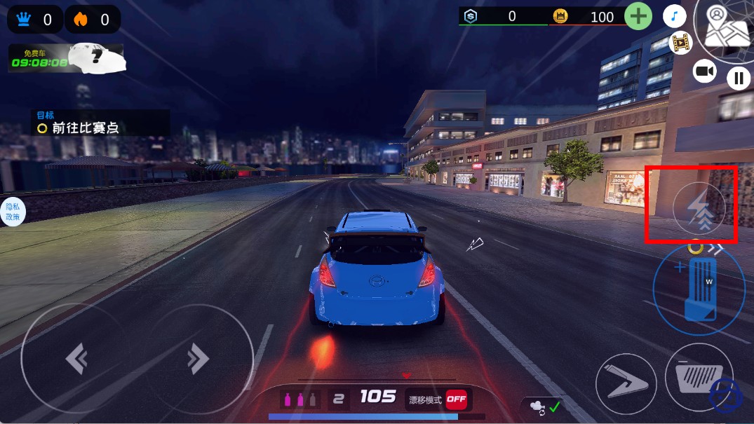 2、在城市夜景賽道,操控左側方向按鈕,能靈活調整賽車行駛方向,躲避其他車輛,順利在道路上前行。