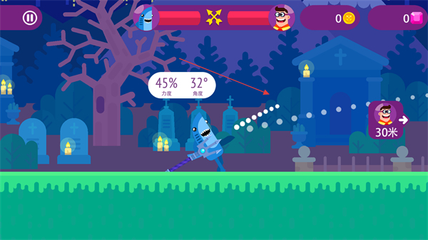 1、進入游戲關卡后,觀察對手的位置,滑動屏幕調整射擊的角度和力度,屏幕上會顯示力度和角度的數值確保能精準射擊。