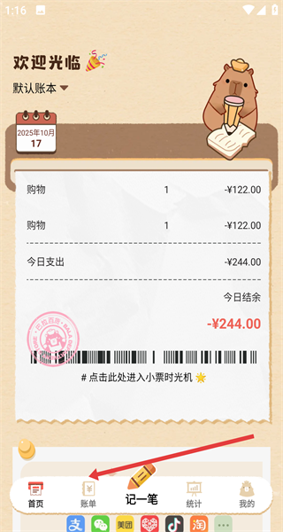 1、進入APP首頁點賬單查看流水,可詳細看到每天的購物支出明細掌握每日消費清晰了解財務狀況。