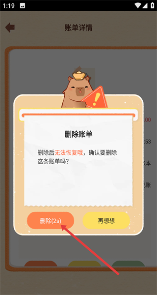 4、彈窗提示刪除不可恢復,確認刪除點刪除按鈕誤觸想要取消點再想想的按鈕,按需管理自己的賬單。