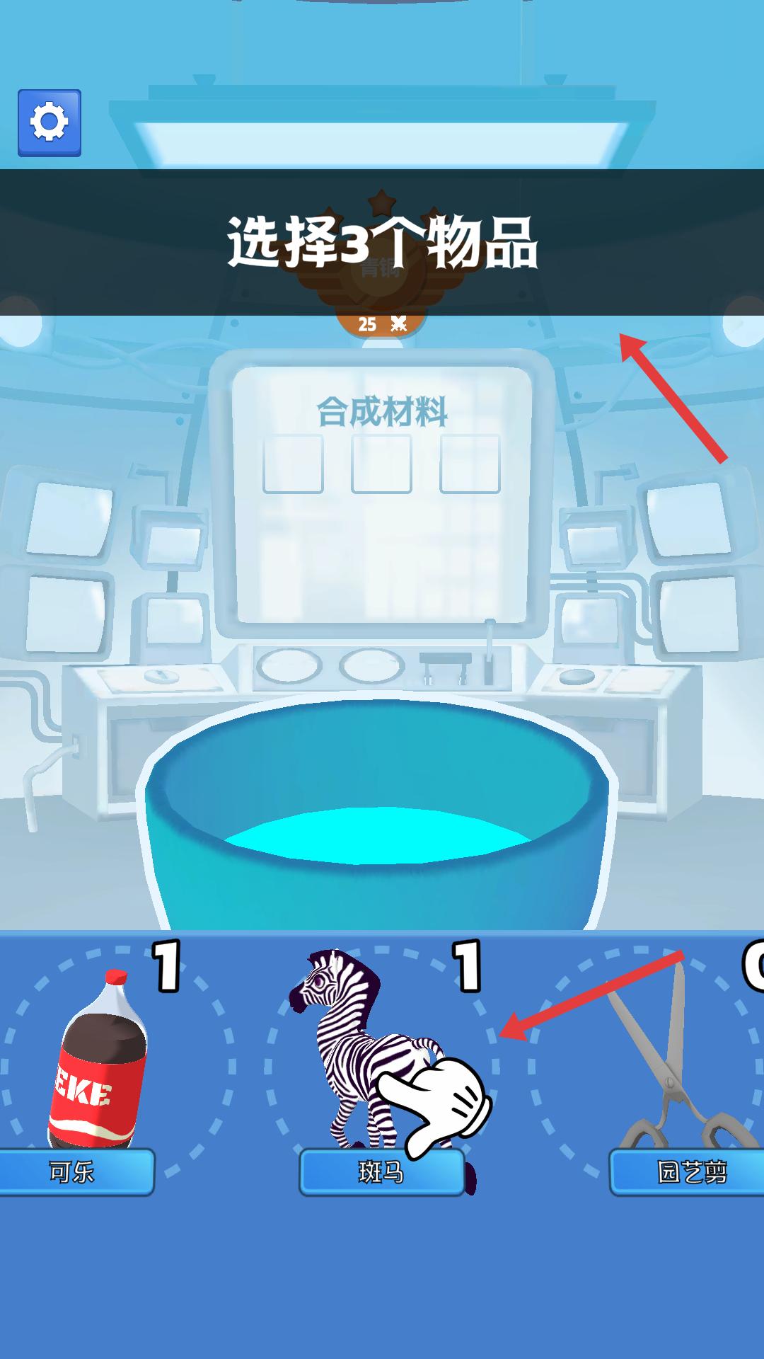 1、進入游戲會看到選擇3個物品的提示,下方有可樂,斑馬,園藝剪等物品,挑選3個物品,為合成怪獸做準備。