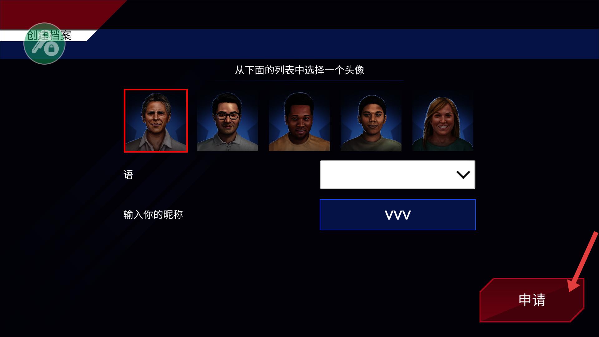 1、在創建檔案界面,從列表中選喜歡的頭像,輸入昵稱后,點擊申請按鈕,即可完成檔案創建,進入游戲。