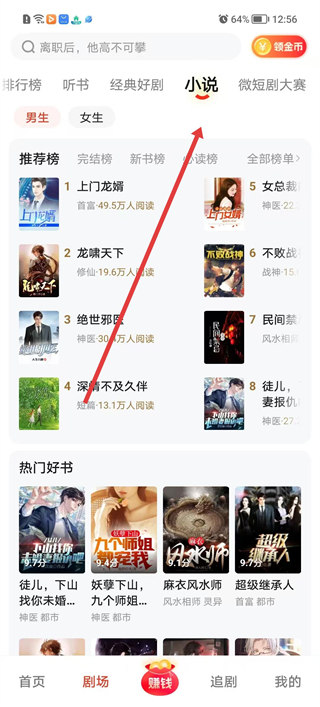 1、打開河馬劇場軟件,點擊小說標簽,可查看上門龍婿、龍嘯天下等小說推薦,還有熱門好書板塊,選擇小說進入閱讀頁。