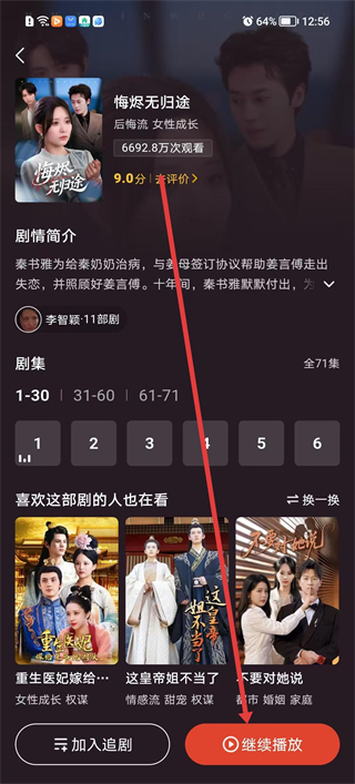 4、在短劇詳情頁,查看劇情簡介、劇集列表,點擊繼續播放可觀看劇集,還能加入追劇,查看喜歡這部劇的人也在看的短劇。