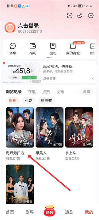3、點擊我的選項,進入個人頁面,可查看瀏覽記錄、在追等內容,選擇悔燼無歸途等短劇進入詳情頁。