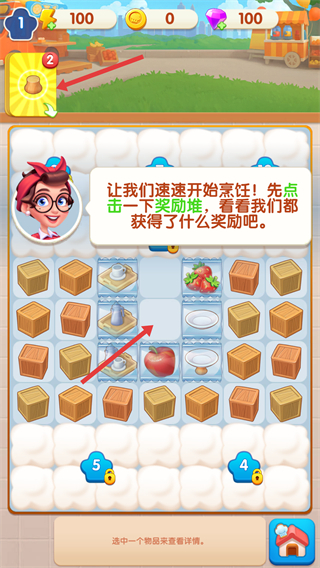 2、進入界面后,點擊獎勵堆,查看獲得的獎勵,了解有哪些物品可用于后續的合并等操作,為烹飪做準備。