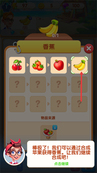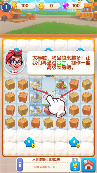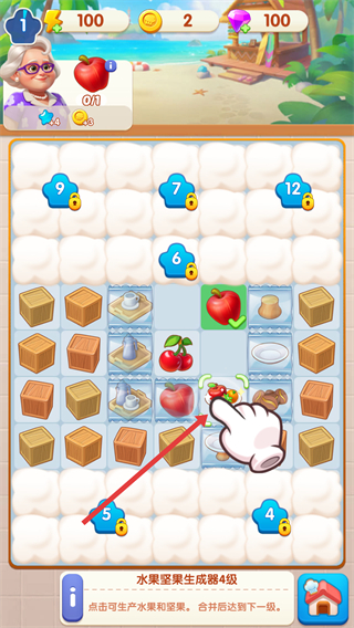 1、可通過水果堅果生成器生產水果和堅果,合并后達到下一級,以此獲取所需食材,推進游戲進程。