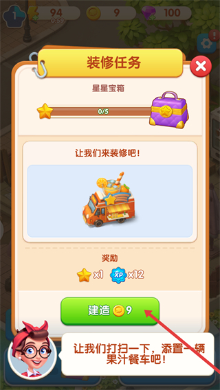 4、可完成裝修任務,如建造果汁餐車,消耗資源后獲得星星和經驗獎勵,提升店鋪的裝修度和經營實力。