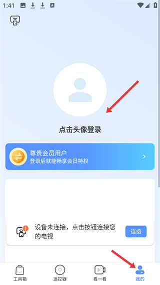 1、進入我的頁面可點擊頭像登錄,還能查看設備連接狀態若設備未連接,可點擊連接按鈕連接電視開啟后續操作。