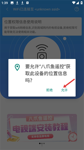 4、當彈出獲取位置信息提示時點擊允許,這樣能獲取WiFi網絡信息識別局域網內電視設備確保相關功能正常使用。