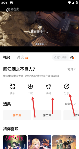 2、在動漫播放頁,可點下載按鈕緩存劇集或點收藏將動漫加入片單方便回看,點分享按鈕分享給好友共同討論觀看。