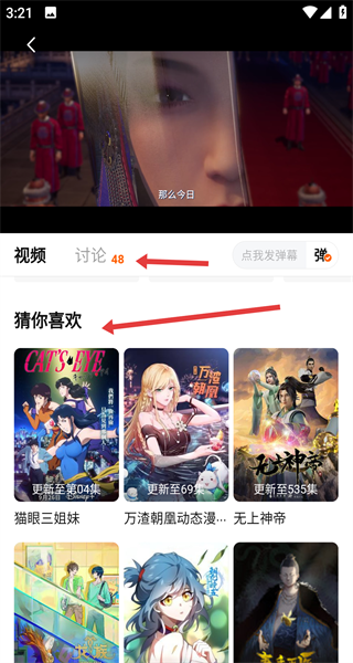 3、播放頁切換到討論頁面能夠查看觀眾互動同樣可以留言參與其中,下滑看猜你喜歡能夠發現更多同類的優質動漫。