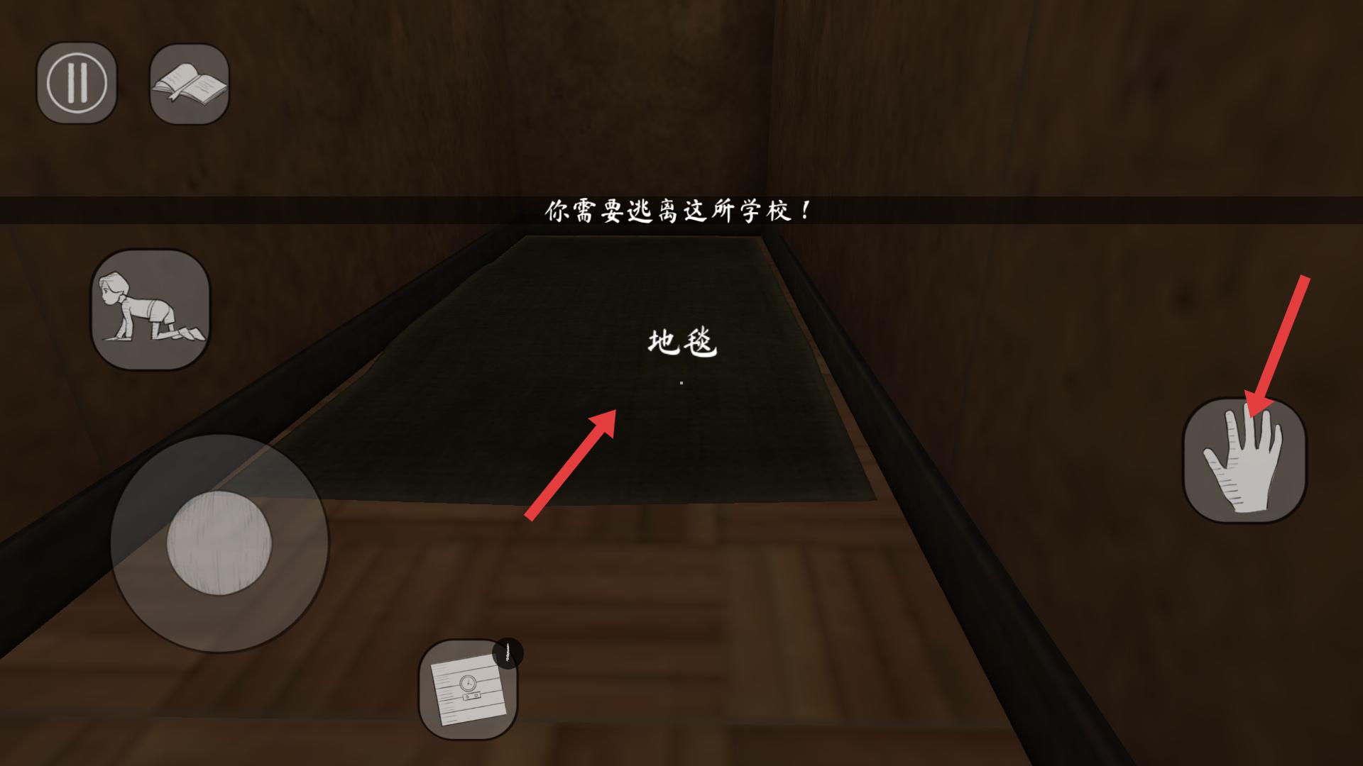 2、游戲提示需逃離學校,看到【地毯】時,點擊手形圖標,可與地毯互動,探索是否有隱藏線索或道具,助力逃生。