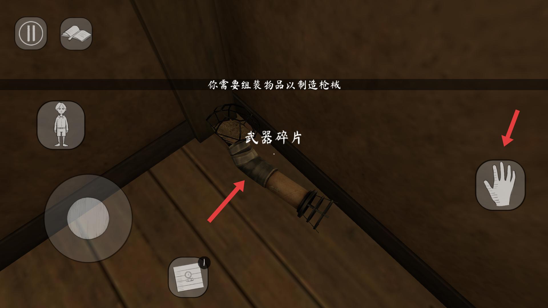 4、游戲提示需組裝物品制造槍械,看到【武器碎片】,點擊手形圖標拾取,收集武器碎片,后續用于組裝槍械,增強逃生能力。