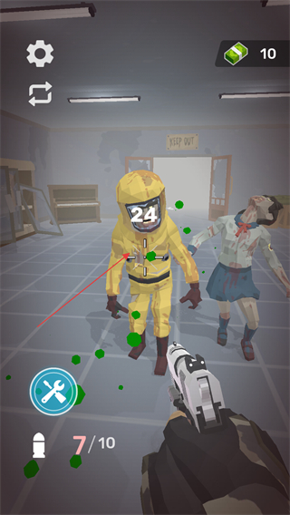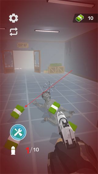 4、消滅僵尸后會掉落綠色的鈔票等資源在,射擊間隙瞄準這些掉落的資源并靠近收集,可以用于在游戲中升級武器、購買道具等。
