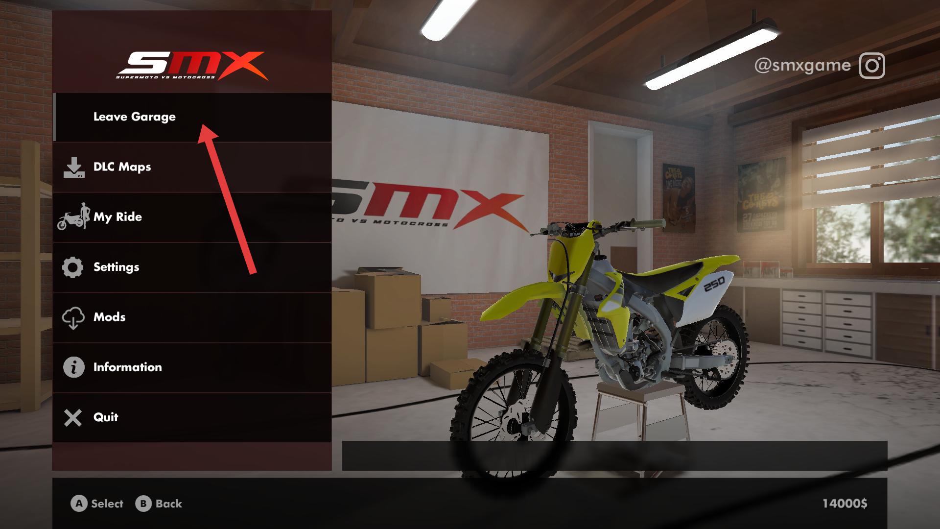 1、點擊Leave Garage選項,離開車庫,準備開啟摩托車駕駛挑戰,為后續騎行做好準備。