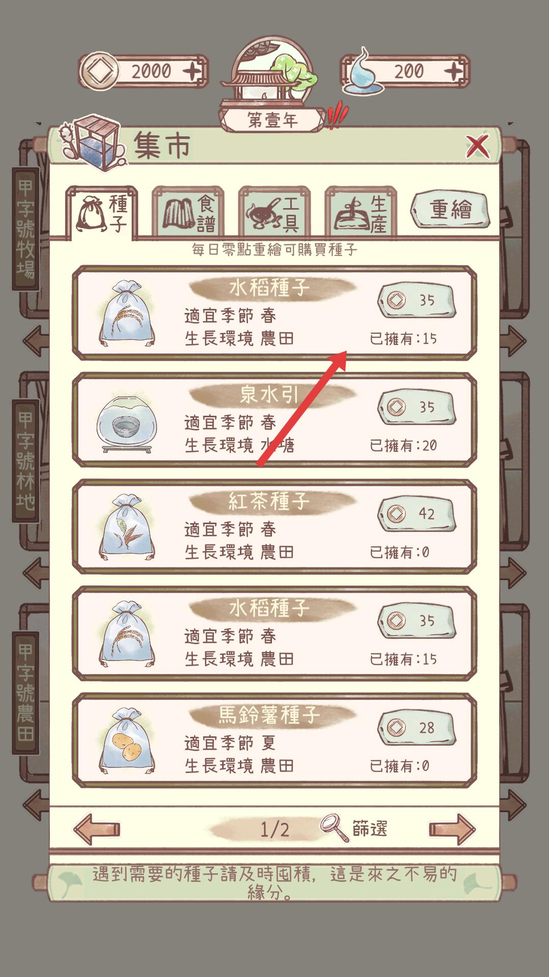 1、前往集市的種子分類,購買適宜季節和生長環境的種子,如水稻種子等,為種植做準備。