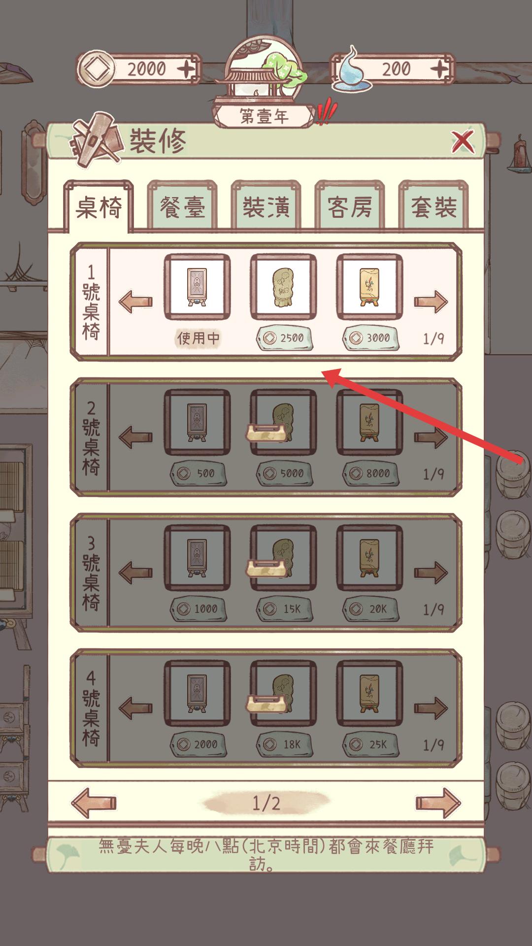 4、進入裝修界面,選擇桌椅、餐臺等裝修類別,購買并更換裝修物品,提升場景的美觀度和功能性。