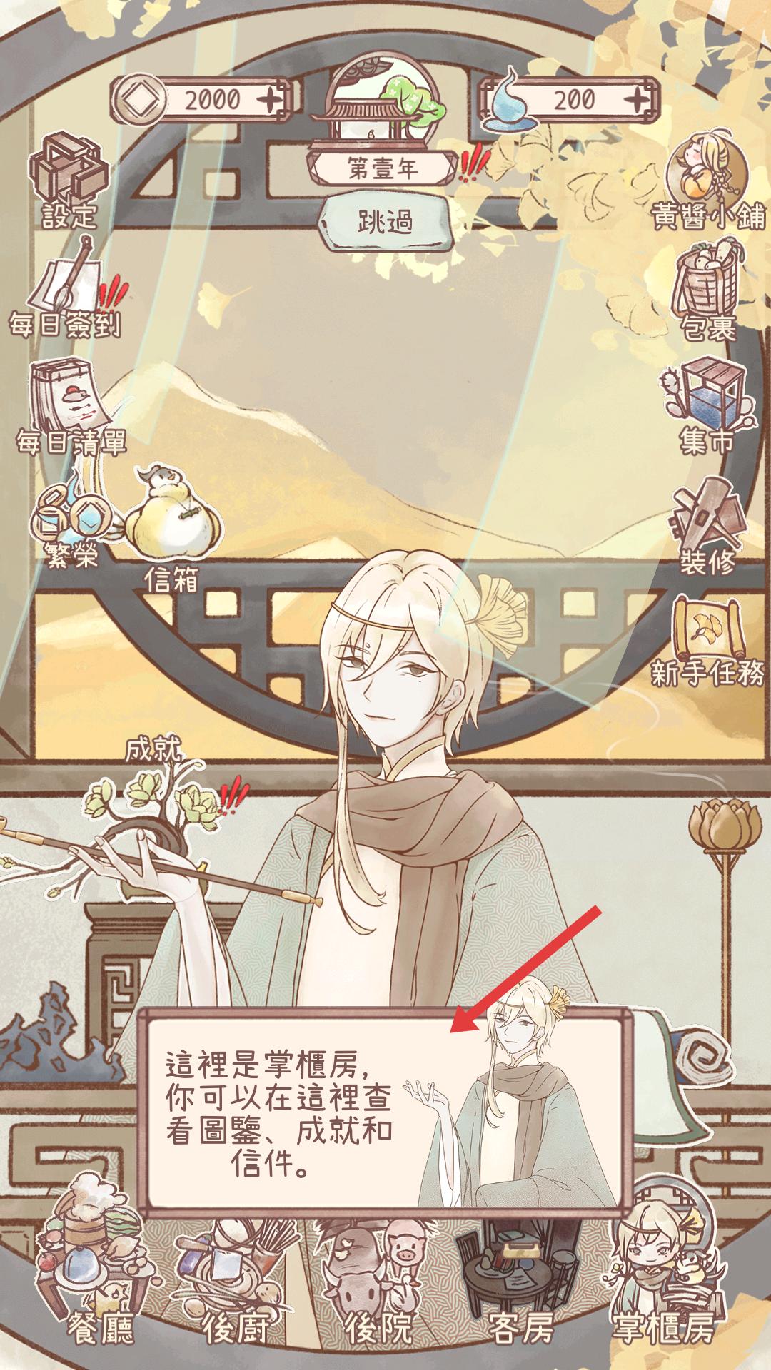 2、進入掌柜房,查看圖鑒、成就和信件,了解游戲內容和進度,獲取相關信息以推進游戲。
