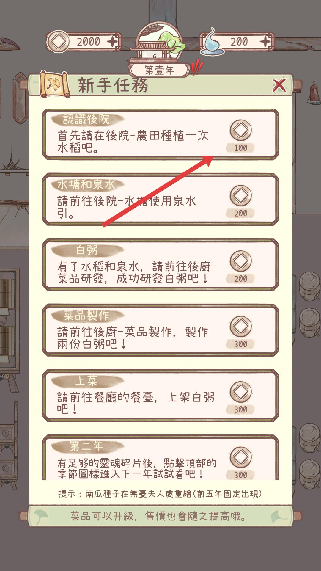 3、完成新手任務,按照任務要求在不同區域進行種植、使用資源、研發菜品等操作,獲取獎勵。