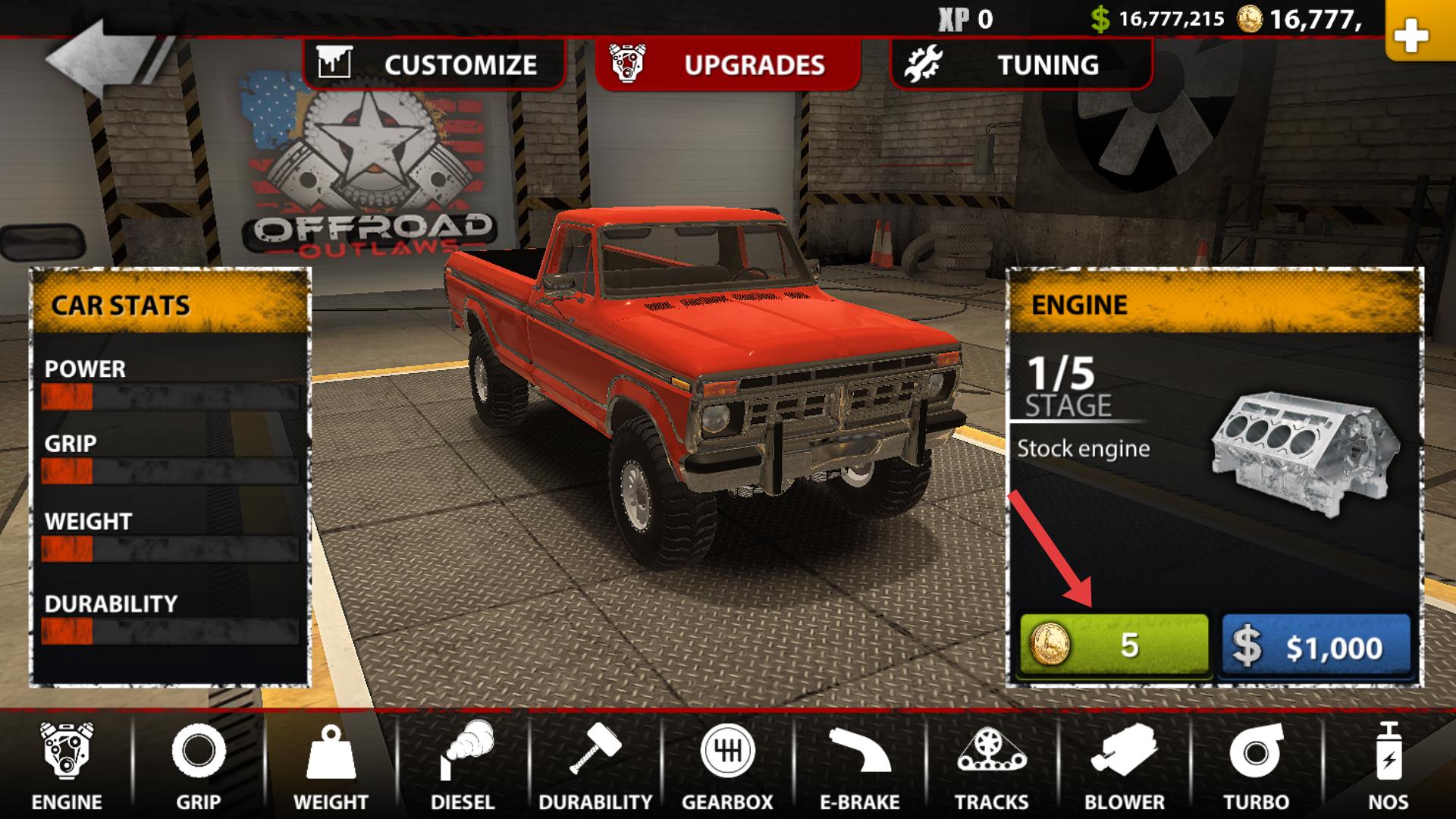 2、在升級界面,選擇ENGINE選項,花費5金幣可升級發動機,升級后能增強車輛動力,讓越野時的加速表現更出色。