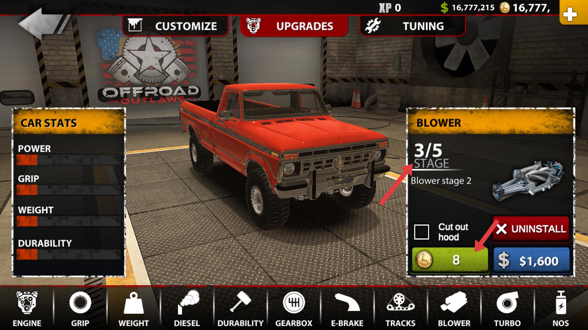 4、選擇BLOWER選項,花費8金幣可升級增壓器到第3階段,升級增壓器能進一步提升車輛動力,助力在越野中取得更好成績。