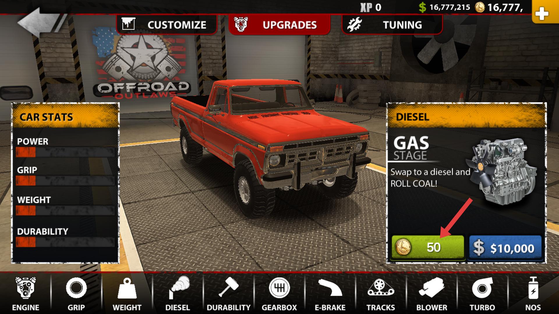 3、切換到DIESEL選項,花費50金幣可將發動機換成柴油發動機在越野場景中會有獨特表現。