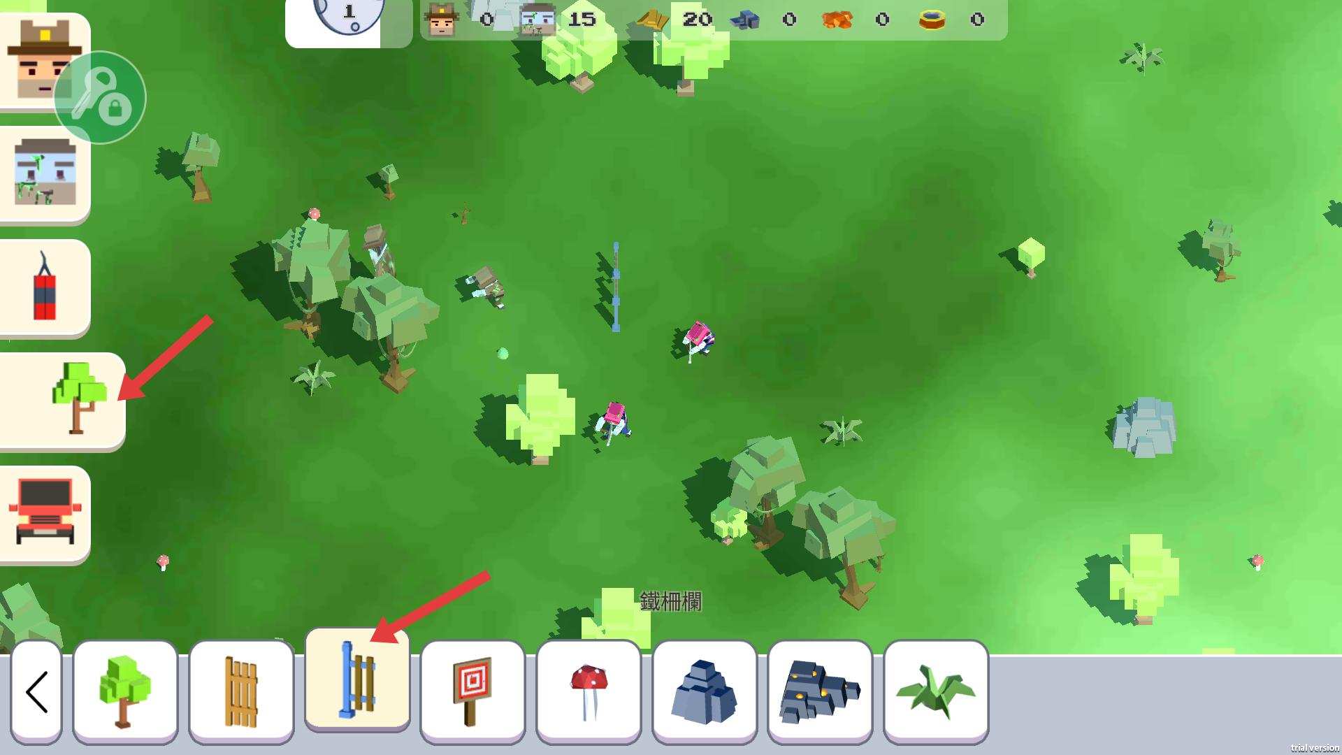4、點擊左側樹木圖標,再選擇下方鐵柵欄圖標,在場景中放置鐵柵欄,阻擋怪物靠近,保護場景內的人物和資源。