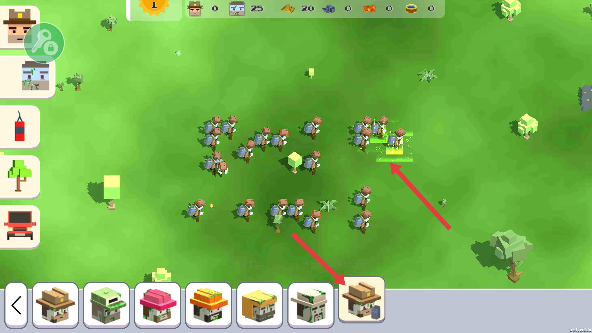 1、選擇下方對應人物圖標,將其放置到綠色場景中,利用聚集的單位,為后續戰斗或資源收集等操作做準備。