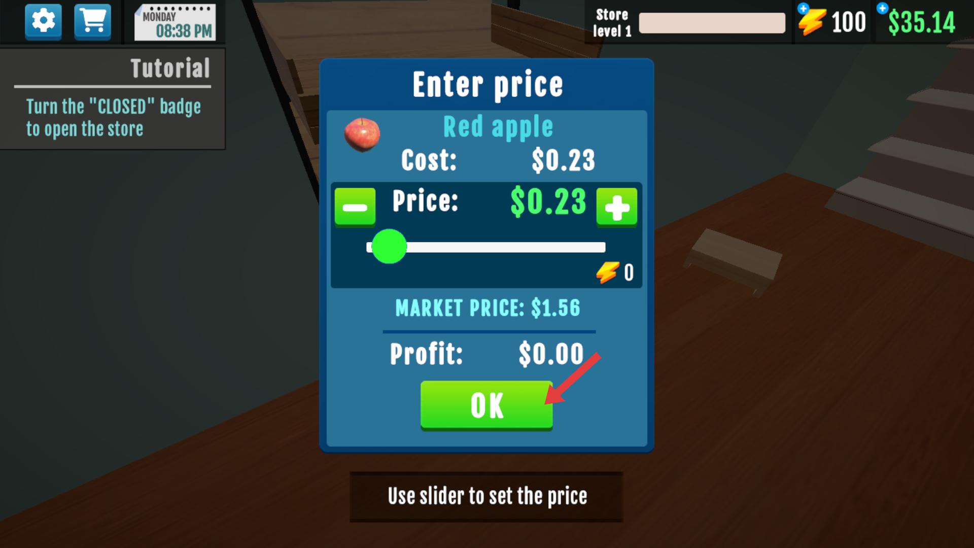4、在價格設置彈窗,利用滑塊調整紅蘋果的價格,調整好后點擊【OK】按鈕確認,可推進店鋪營業流程。