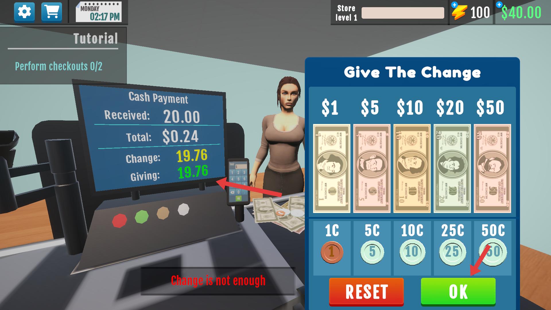4、收到付款后,根據應找零金額,選擇合適面額的貨幣組合,點擊【OK】按鈕找零,注意要確保零錢足夠,順利完成找零操作。