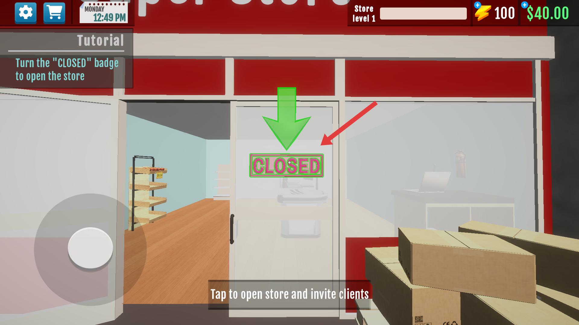 1、點擊門上的CLOSED標識,打開店鋪,這樣就能邀請顧客進店,開啟店鋪是迎接顧客、開展后續經營的第一步,要及時操作。