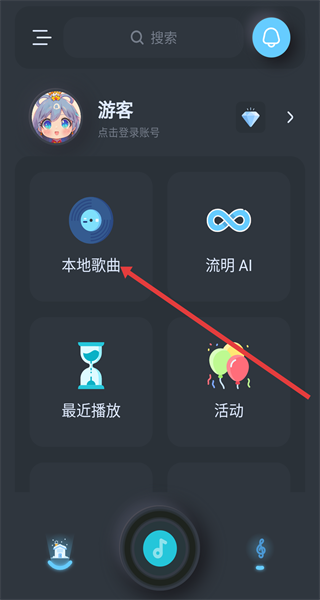 1、打開音樂APP點擊首頁下方第一個小房子圖標,點擊本地歌曲進入本地音樂管理頁準備掃描本地音頻文件。
