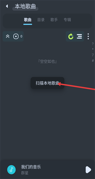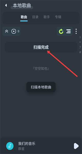 4、掃描完成后頁面顯示掃描完成,可查看識別出的本地歌曲管理手機音頻文件,如果本機無本地音樂則會顯示空空如也。