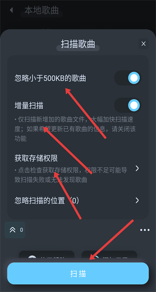 3、在掃描設置頁按需開啟關閉忽略小于500KB的歌曲和增量掃描等設置,確認存儲權限后點擊掃描開始檢索本地音樂。