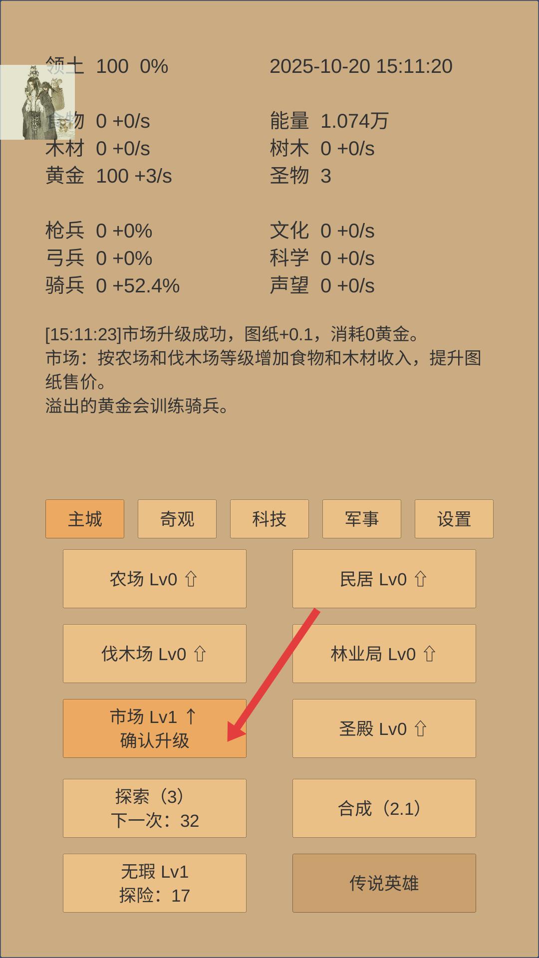 2、市場可升級,升級后能按農場和伐木場等級增加食物、木材收入,還提升圖紙售價,溢出黃金會訓練騎兵,可點擊確認升級提升市場等級。