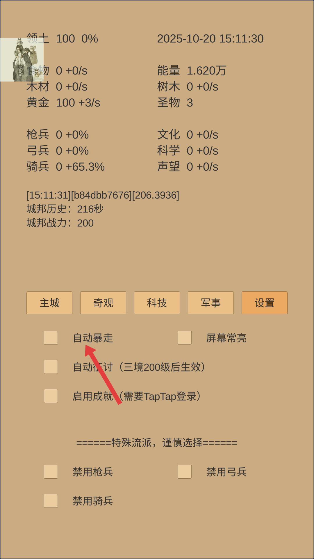 4、進入設置界面,有自動暴走、屏幕常亮等功能選項,還有特殊流派相關的兵種禁用選擇,可根據需求勾選設置。