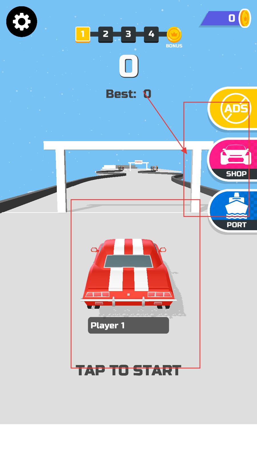 1、玩家進入游戲,駕駛紅色賽車開啟賽道挑戰,同時可通過SHOP升級賽車、PORT解鎖新賽道區域。