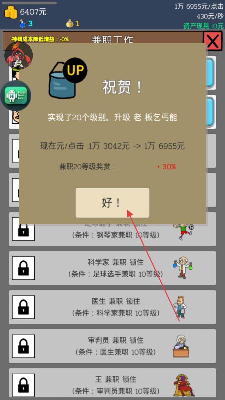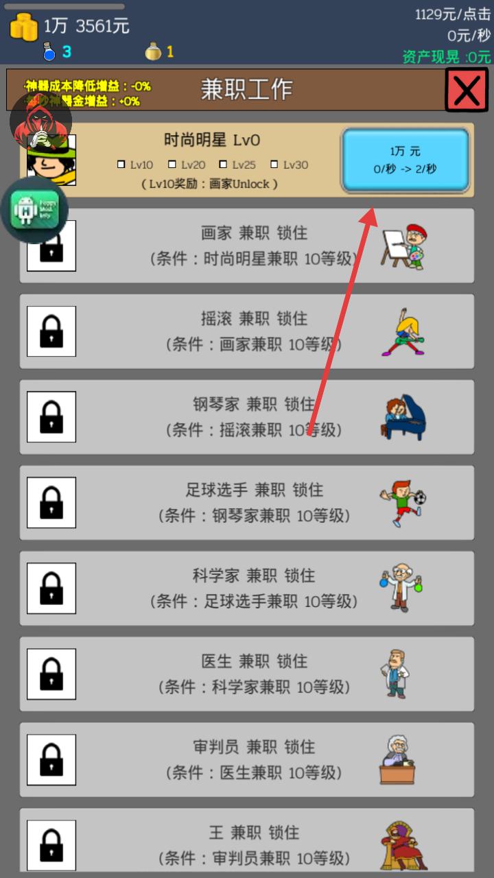 3、在相關界面,花費相應資金解鎖新的兼職,開啟自動收益,增加獲取資金的途徑,讓資金能更穩定地增長。