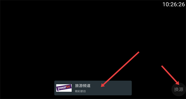 3、播放頁若遇到黑屏卡頓的情況,可以點右下角換源切換播放源如旅游頻道,解決播放卡頓黑屏的問題。