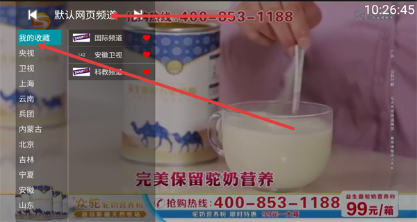 4、打開App在側邊欄點我的收藏,可以快速訪問已收藏頻道如國際頻道,直接播放節目或廣告內容,還可以切換默認網頁頻道。